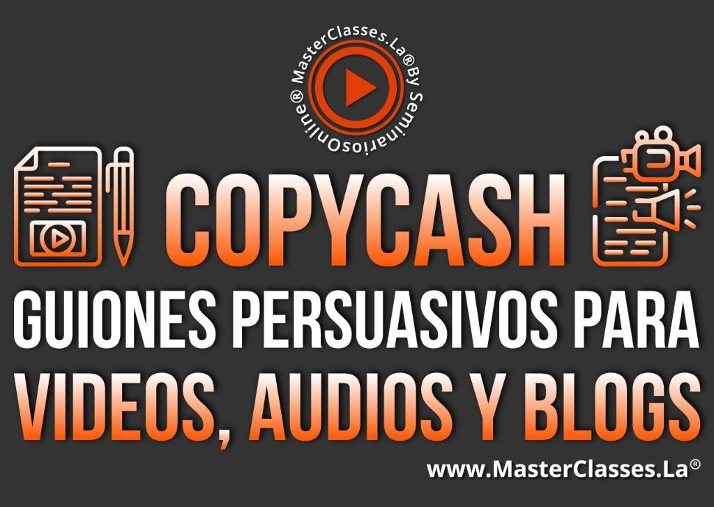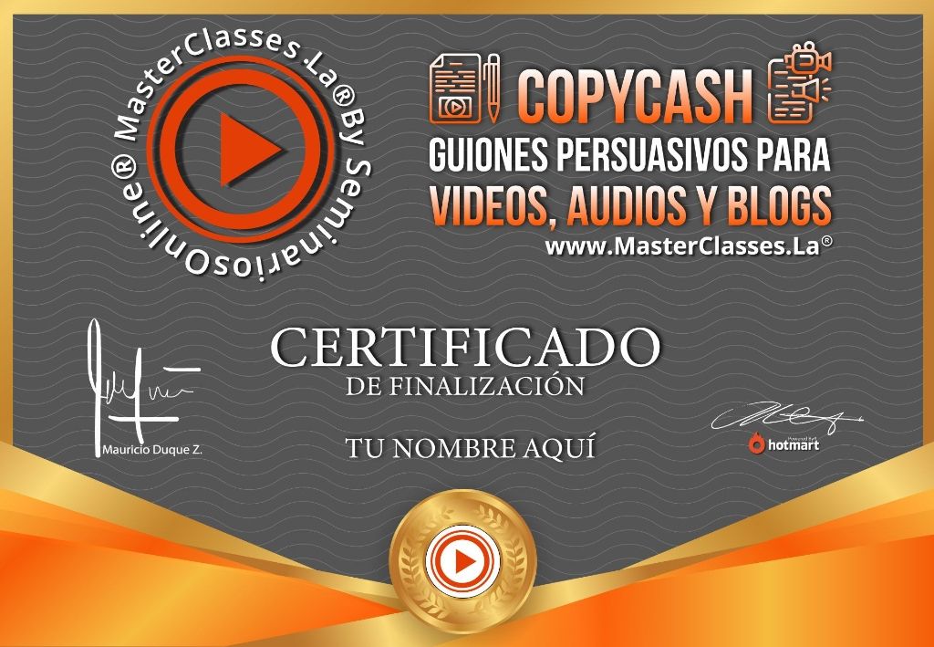 ¡Descubre los secretos mejor guardados del mundo del copy y genera ventas contundentes con el MasterClass de COPYCASH! Aprende a escribir guiones persuasivos para videos, audios y blogs y domina los gatillos psicológicos que te ayudarán a conquistar, convencer y enamorar a tus clientes. Con herramientas prácticas y ejercicios, aumentarás tus conversiones y crearás contenidos irresistibles. Obtén tu certificado avalado por Hotmart y Seminarios Online. ¡No pierdas la oportunidad de mejorar tu comunicación persuasiva y generar ventas sorprendentes!