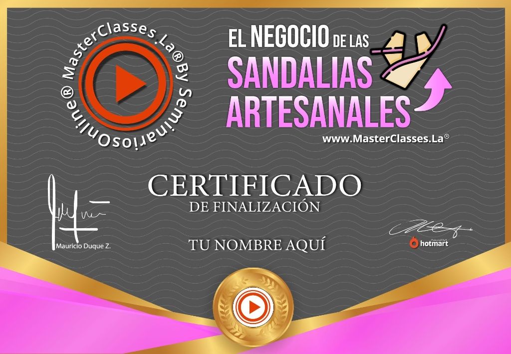 ¿Quieres tener tu propia línea de calzado? Con el MasterClass EL NEGOCIO DE LAS SANDALIAS ARTESANALES aprenderás a diseñar, confeccionar y comercializar tus propios modelos de sandalias. Descubre tu talento y creatividad ocultos, sin necesidad de experiencia previa. Aprende a tu propio ritmo desde la comodidad de tu casa. Obtén herramientas para lograr un buen diseño e impulsar tu línea de calzado. Además, accede a un certificado avalado por Hotmart y Seminarios Online. ¡Emprende tu propio negocio y descubre todo lo que puedes lograr!