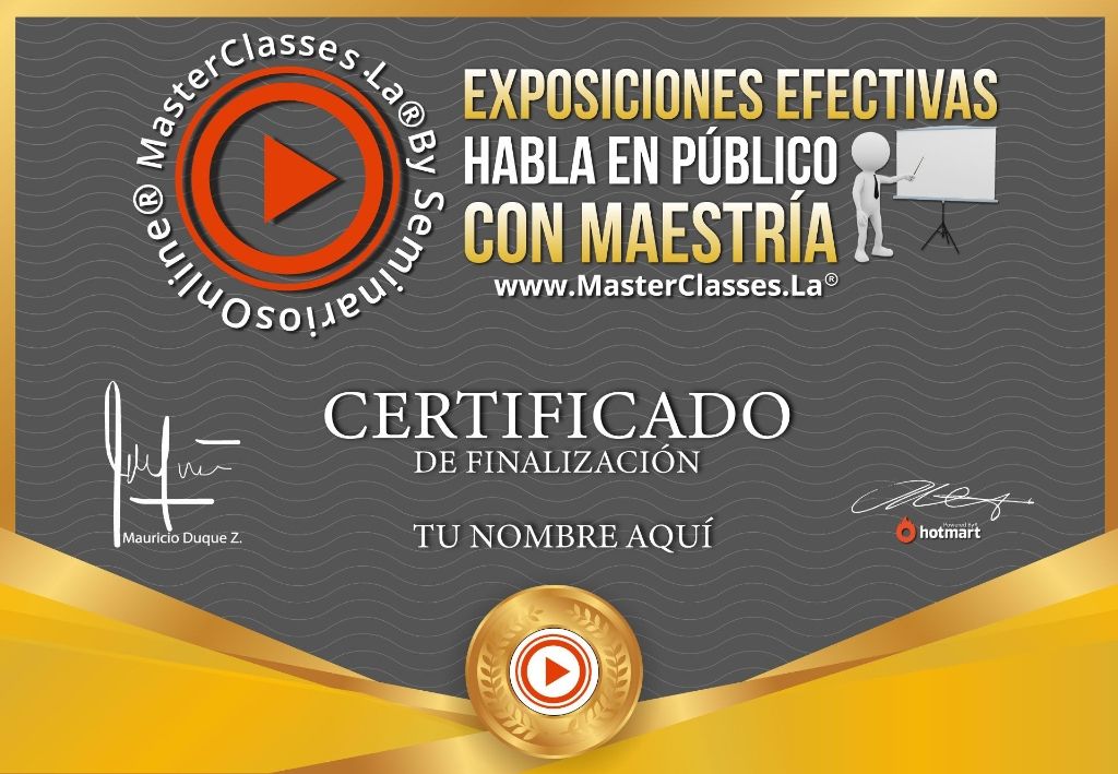 El MasterClass EXPOSICIONES EFECTIVAS, HABLA EN PÚBLICO CON MAESTRÍA es un curso que te ayudará a convertirte en un gran orador, dominando el miedo escénico y proyectando seguridad en tus exposiciones. Aprenderás a ordenar tus ideas, desarrollar habilidades de liderazgo y superar el miedo a hablar en público. Con técnicas fundamentales y contenido estructurado paso a paso, lograrás llevar tus exposiciones a otro nivel y conseguir un mejor puesto de trabajo. Además, recibirás certificado avalado por Hotmart y Seminarios Online.