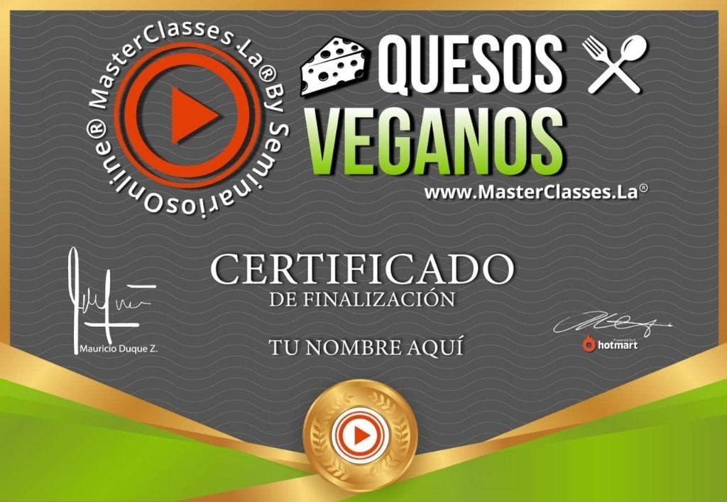 ¡Descubre el increíble mundo de los quesos veganos con el MasterClass QUESOS VEGANOS! Aprende a preparar deliciosos quesos crema, Ricotta, Pepper Jack, Cheddar y Mozzarella, y disfruta de su sabor y consistencia sin tener que renunciar a tus valores veganos. Convierte este conocimiento en una oportunidad de negocio y sorprende a tus amigos y familiares con tus creaciones caseras. Además, accede a una comunidad de nutrición en redes sociales y obtén un certificado avalado por Hotmart y Seminarios Online. ¡No te pierdas esta experiencia única!